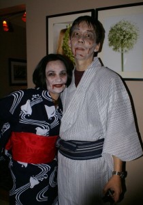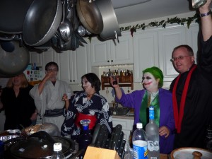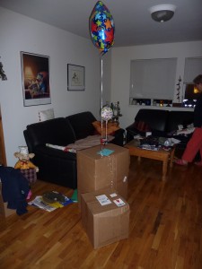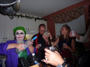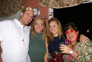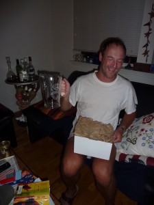 Exactly at midnight we lit the candles on the cake and went to the bedroom ready to sing 🙂 Elke and I were just starting to sing when he came out of the dark from behind the door and has us so scared that I almost threw the cake .. Elke and I had blood pressure of 300 at least ..