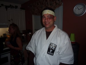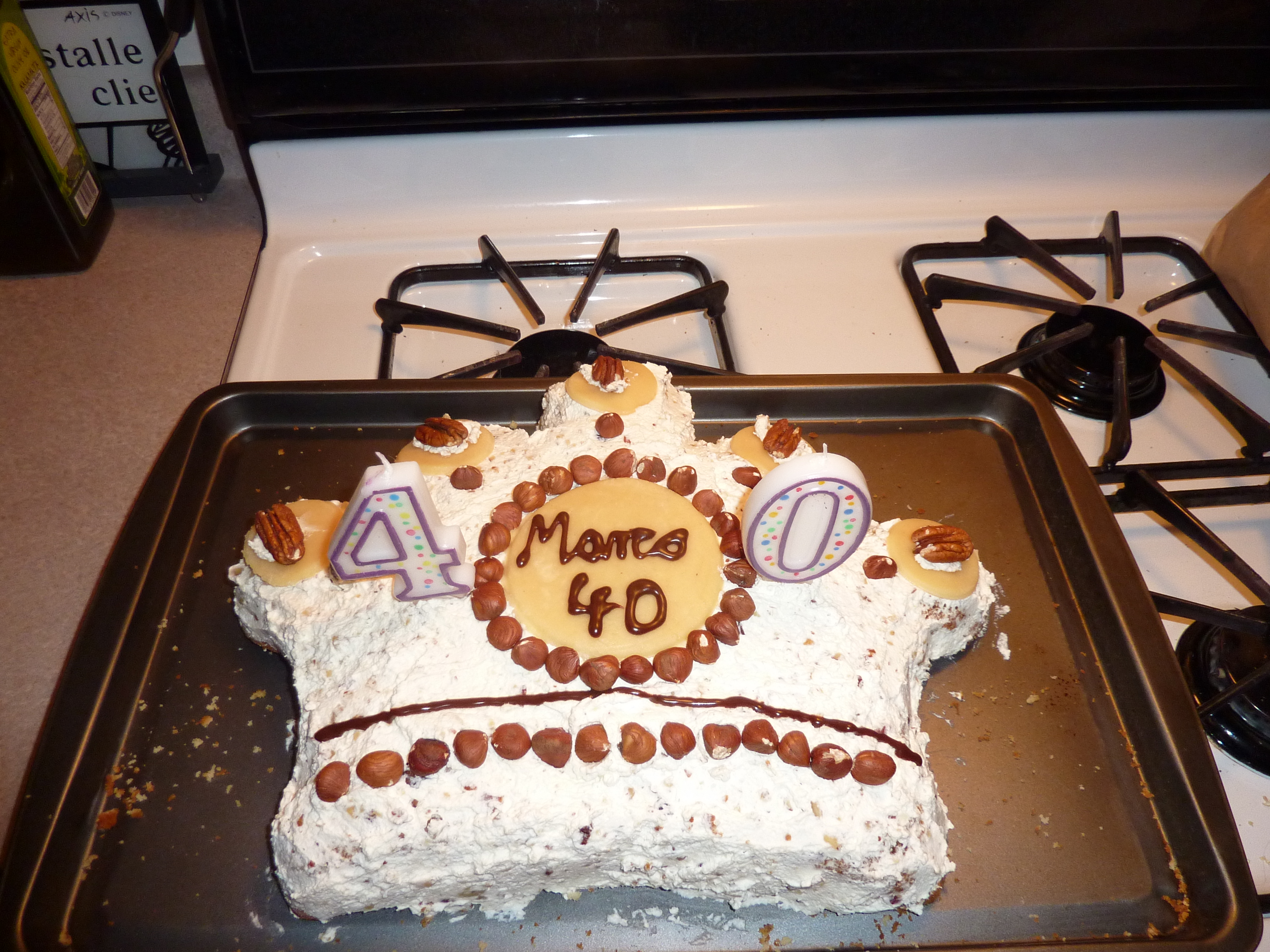 Er, dessen Alter keiner kennt, wird 40! Neben diversen Geschenken gibt es natuerlich eine Party und einen Geburtstagskuchen .. Tante Elke und ich haben uns also maechtig ins Zeug gelegt um einen koeniglichen Geburtstagskuchen herzustellen .. das Problem an der Sache ist .. er, der nicht jeden Kuchen isst, mag eigentlich nur Nusskuchen mit Marzipandecke .. und genau das ist in den USA nicht soo einfach. Hier gibt es tonnenweise uebersuessten Kuchen ohne Nuesse und Marzipan, aber Nuss und dann noch mit Marzipan .. schwierig .. Zum Glueck hatte ich ja meinen deutschen Freund Dr. Oetker, der in Form einer Nusskuchenbackmischung in die USA importiert wurde … Ich hatte vorher schon eine Backform in Kronenform gekauft und das sollte der Kuchen werden. Elke und ich haben also die Kronenform befuellt und dann gaaaanz vorsichtig in der Mitte durchgeschnitten, um die Nuss-Sahne einzufuellen. Statt der Marzipandecke gab es aber nur Marzipanverzierungen. Puenktlich 23:50 waren mit dem Kuchen fertig .. er, dessen Alter um eine Zahl erhoeht wird, lag schon im Bett …