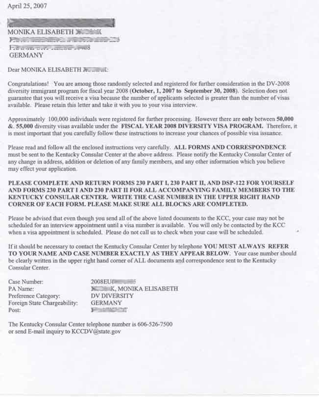 The Kentucky Consular Center in Williamsburg, Kentucky has registered and notified the winners of the DV-2008 diversity lottery. The diversity lottery was conducted under the terms of section 203(c) of the Immigration and Nationality Act and makes available *50,000 permanent resident visas annually to persons from countries with low rates of immigration to the United States. Approximately 96,000 applicants have been registered and notified and may now make an application for an immigrant visa. Since it is likely that some of the first *50,000 persons registered will not pursue their cases to visa issuance, this larger figure should insure that all DV-2008 numbers will be used during fiscal year 2008 (October 1, 2007 until September 30, 2008).