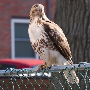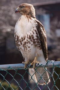 Das ist unser neuer Nachbar. Ein red-tailed Hawk (rotschwaenziger Bussard). Er fliegt mindestens einmal am Tag ueber unser Haus und letzte Woche sass er auf dem Zaun direkt vor unserem Auto mit einem toten (und nicht mehr kompletten) Tier in den Krallen. Sehr eindrucksvoll!